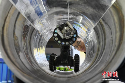 图为活动现场展示的管道智能检测机器人吸引民众关注。