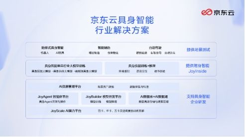 基于这些积累,京东云正式推出具身智能行业解决方案,通过提供从万卡算力到实战工具的全套平台,服务具身智能企业从模型训练与具身Agent开发的全流程。同时,依托京东自研的JoyInside附身智能,为智能体注入环境感知、语音交互与动作规划的核心能力。