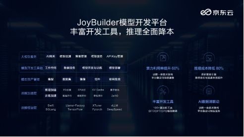 在模型训推方面,京东云JoyBuilder打造了三大核心优势:首先,得益于自研的高性能推理引擎,模型训练与推理效率提升400%;其次,平台集成50种开源模型和数据集,提供100余种算法工具链,让企业能基于自身数据快速构建专属大模型;最终,通过高可用云原生系统实现的秒级扩缩容能力,在保障服务稳定性的同时,总体应用成本降低80%。